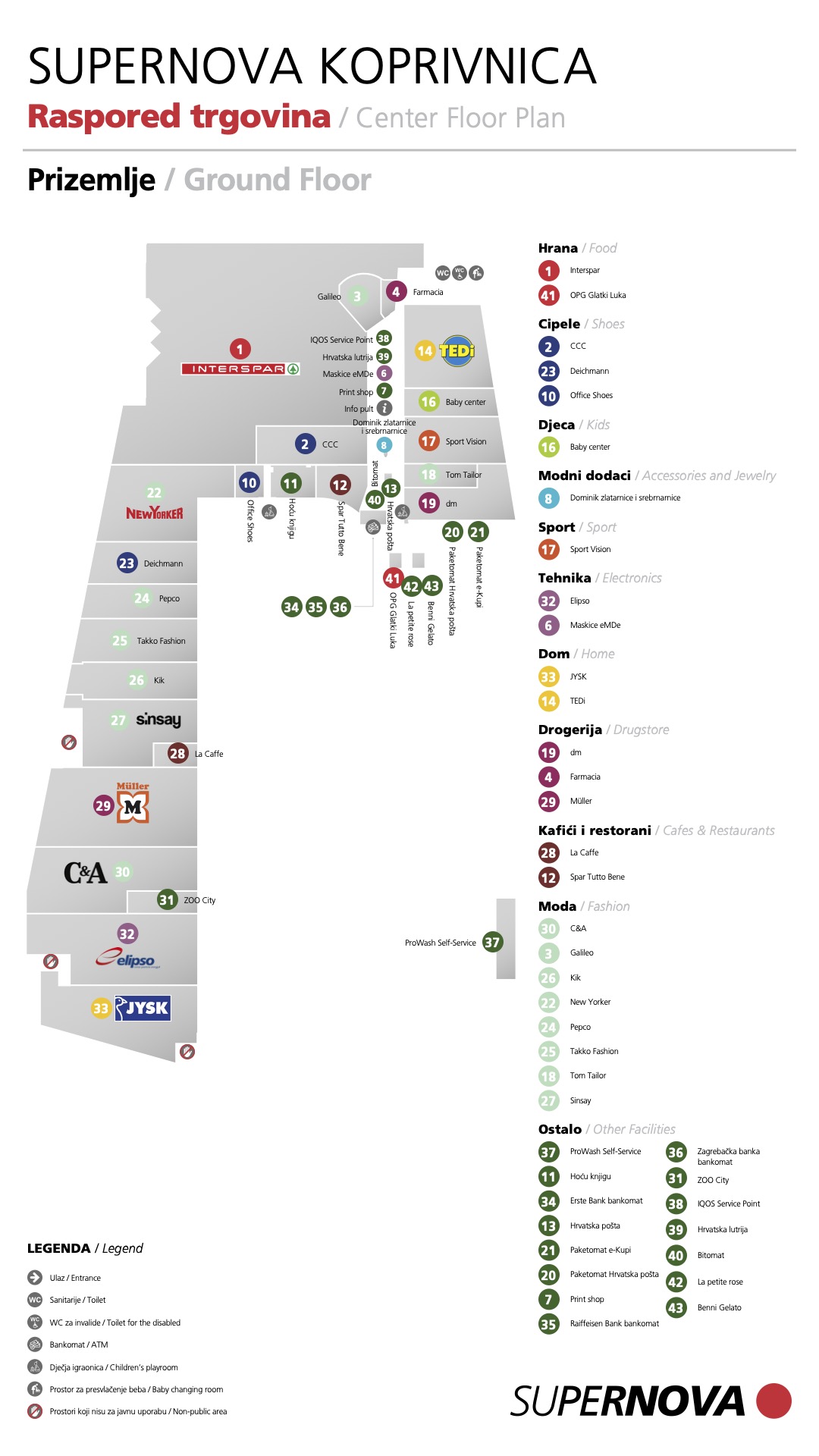 Ovdje možete pogledati mapu shopping centra Supernova Koprivnica. Kliknite i provjerite naše trgovine i usluge!